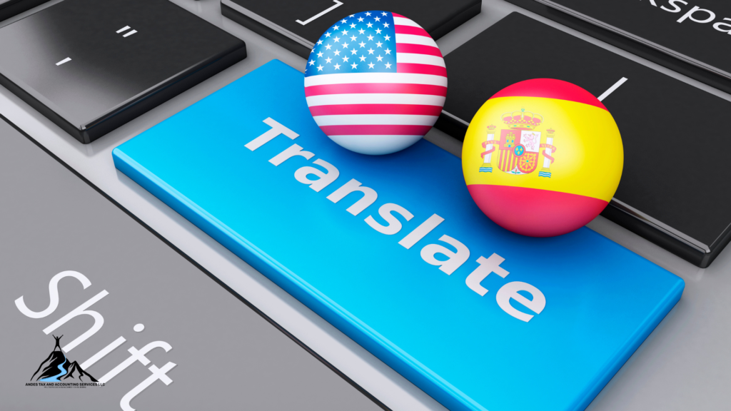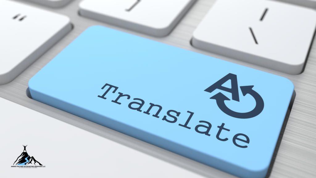 Con Andes Tax and Accounting Services LLC, usted recibe un servicio de traducción preciso, rápido y confidencial. Nos aseguramos de que cada documento esté traducido de forma fiel al original, manteniendo la integridad de la información y los matices legales o comerciales necesarios. Ofrecemos traducción profesional en español e inglés para facilitar su comunicación y documentación en ambos idiomas.